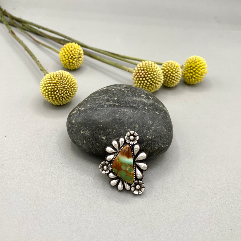 The Flora ring, with its meticulously handcrafted sterling silver flowers, features an amazing piece of natural high-grade Royston turquoise mined in Nevada. This beautiful stone, with its polychrome bands of green, brown, and white, is paired with ornate handmade solid silver teardrop and floral detailing. This beauty is bursting with botanical flair.