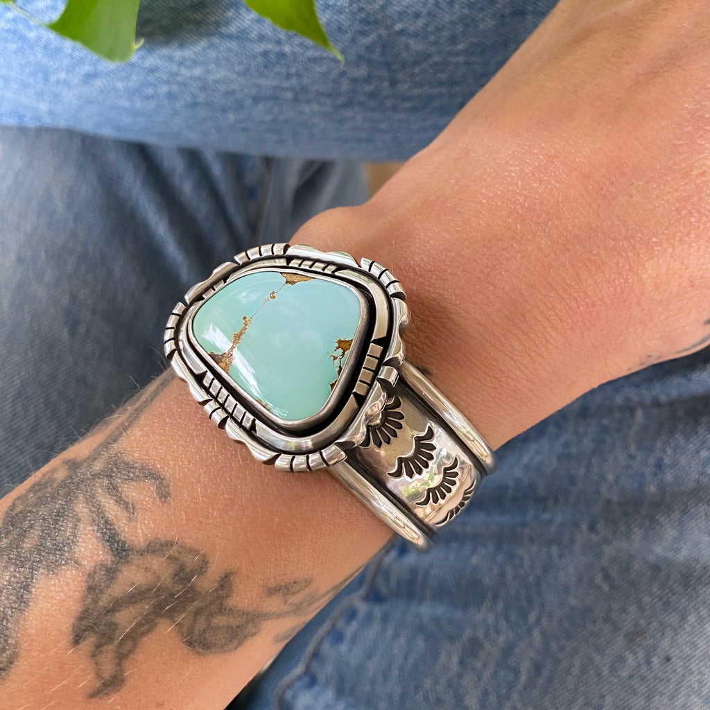 The Silhouette cuff is entirely hand-stamped and hand-fabricated. This ornate bracelet has a lot of detailing: a wide, intricately stamped sterling silver band paired with a setting featuring 2 meticulously sawed and filed sterling frames. This piece features a stunning piece of natural high-grade Royston turquoise mined in Nevada. This spellbinding stone, with its blue to green fade and delicate matrix, is set in a hand-fabricated sterling silver setting atop a chunky hand-stamped solid sterling band. This large scale statement piece was a true labor of love to make.