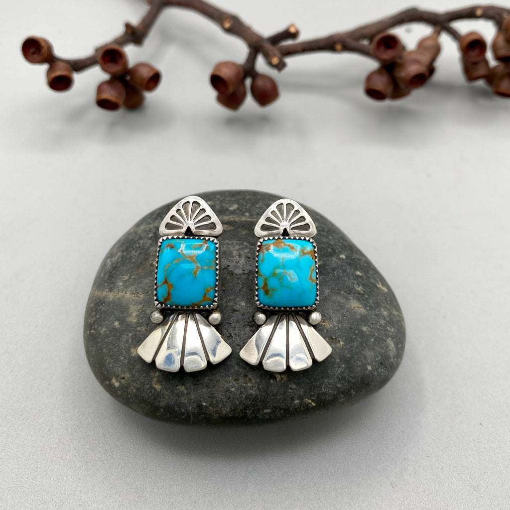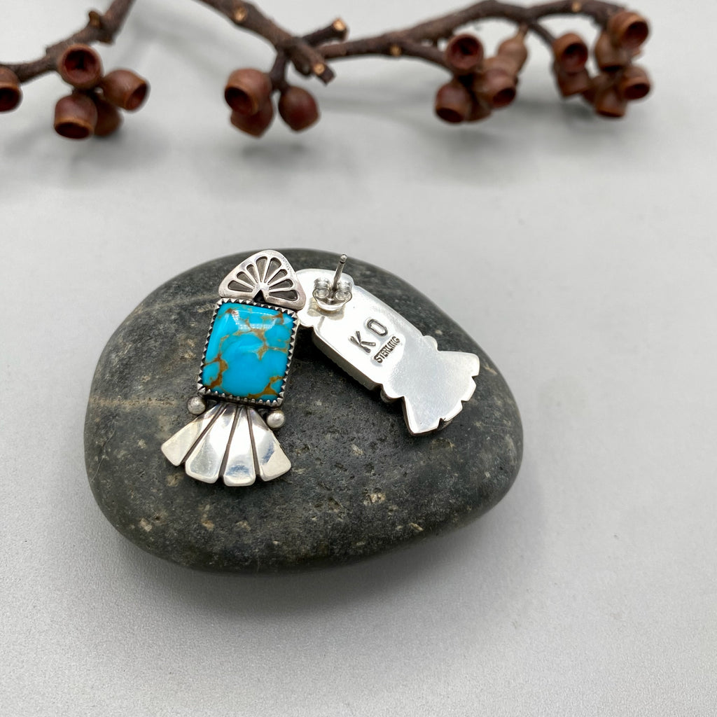 The Cupid's Arrow earrings are a unique design that features hand-stamped sterling silver overlay details and contoured sterling fans. These entirely hand-fabricated statement pieces are made around two pieces of Kingman turquoise mined in Arizona. The stones, with their bright blue color and warm brown matrix, are the perfect match for their intricate sterling settings. This streamlined design will take your breath away.