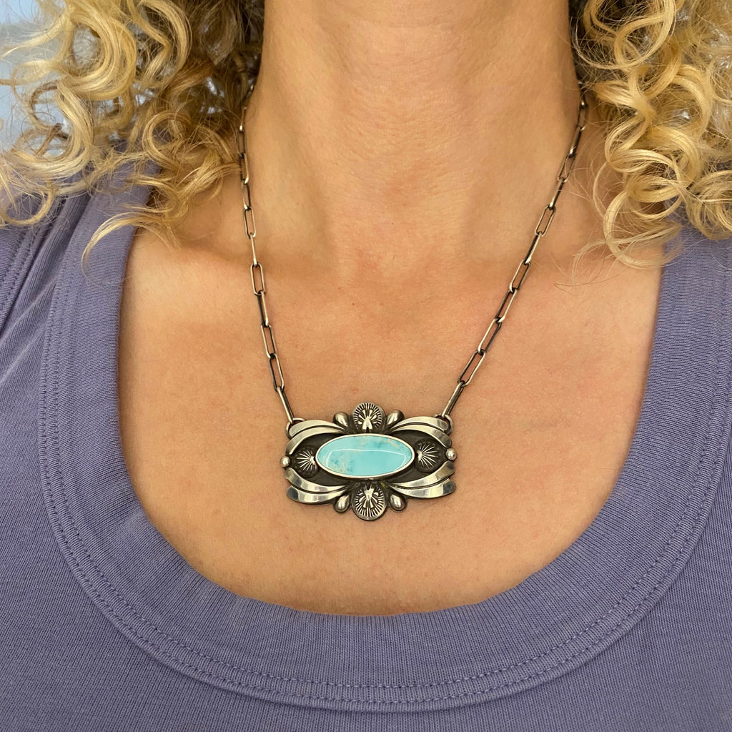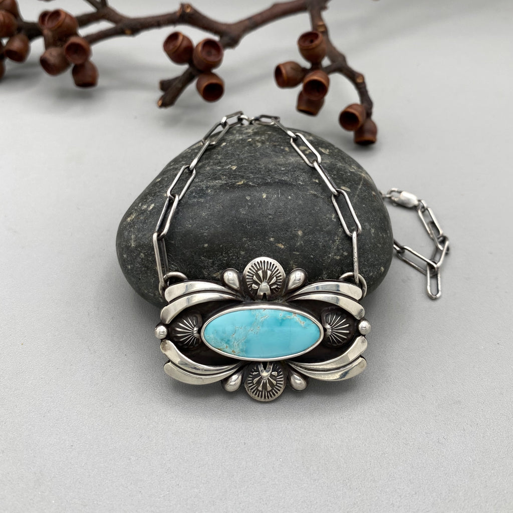 The Aura necklace features a beautiful piece of natural high-grade Royston turquoise mined in Nevada. This stone, with its gemmy baby blue color and delicate matrix, is a perfect companion to its ornately detailed solid sterling silver setting. The setting is entirely handmade and features hand-stamped and contoured sterling fans and overlays, silver teardrops, and petite silver bubble details. The design is further accented by recessed jet-black patina detailing for a statement piece with lots of depth, shine, and contrast. This is perfect statement piece for fans of intricate and unique silver jewelry. This necklace has an 18" sterling silver paperclip chain.
