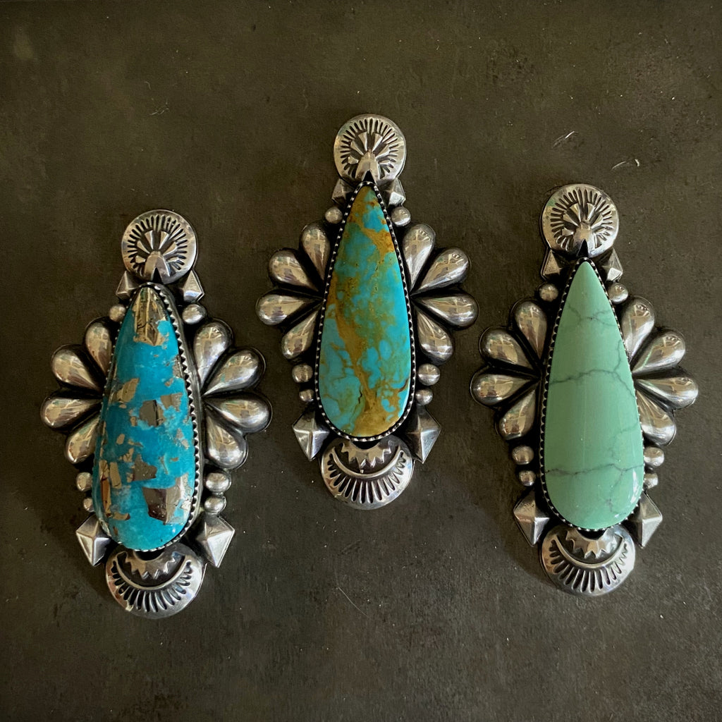 The Dagger ring features a stunning piece of Rising Phoenix turquoise mined in Arizona. This stone, with its bright turquoise color and swirls of golden matrix, is paired with handmade silver diamond adornments, contoured sterling overlay accents, silver teardrop detailing, and petite silver bubbles for an elegant piece with tons of meticulous detailing. This stylish statement piece is perfect for daily wear.