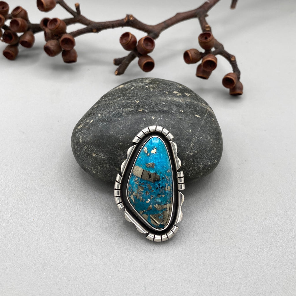 The Shadowbox ring features a stunning piece of shimmering Ithaca Peak turquoise mined in Arizona. This stone, with its super bright blue color with chunks of golden pyrite, is paired with a super chunky, meticulously sawed sterling silver frame. The ornate sawed detailing highlights the stone's vivid hues, and is further accented by the recessed jet-black patina detailing. A heavyweight heirloom piece that's perfect for all occasions.