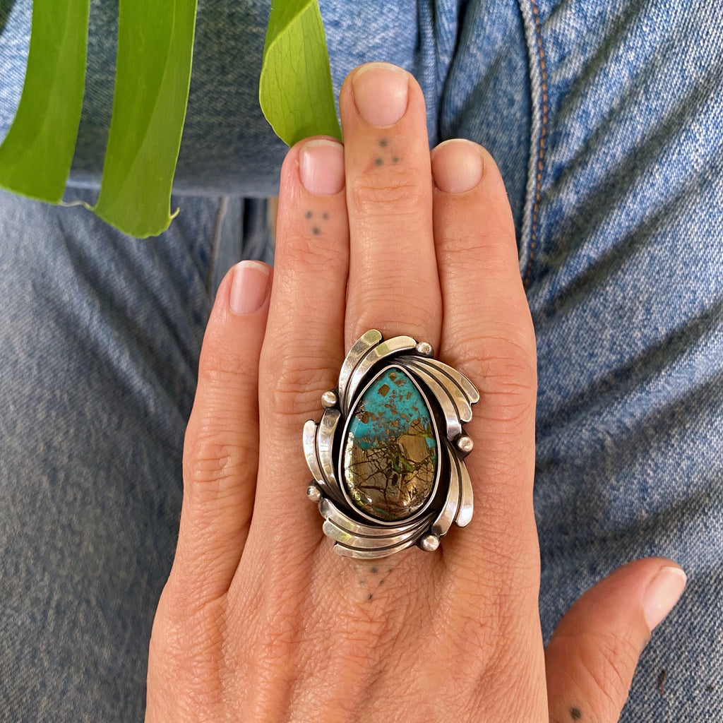 The Wave ring features a gorgeous piece of shimmering Morenci II turquoise. This stone, with its bright blue color and loads of golden pyrite, is set in a piece inspired by cresting and breaking ocean waves. Completely handmade and featuring contoured sterling silver fan details and petite silver bubble accents, this oceanic statement piece is perfect for daily wear all year round.