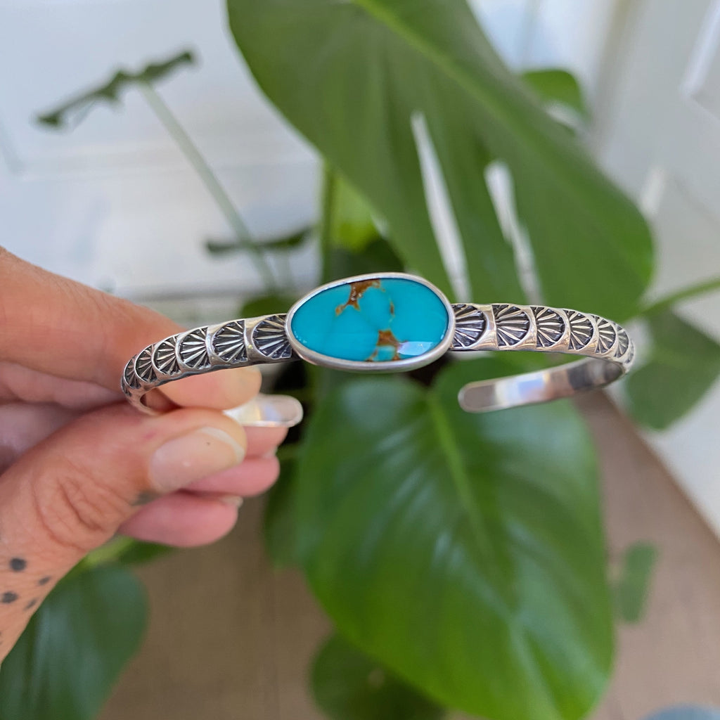 This hand-stamped cuff bracelet is fabricated out of chunky 4 gauge sterling silver. This ornate cuff features an awesome piece of Royston turquoise mined in Nevada. This stone, with its vibrant colors and freeform shape, is set in a hand-fabricated, one-of-a-kind, sterling silver setting atop a hand-stamped solid sterling band.