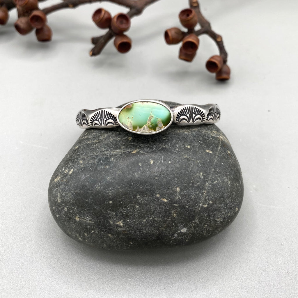 This heavyweight hand-stamped sterling silver cuff is fabricated out of super chunky 2 gauge sterling silver. This ornate bracelet features an exquisite piece of natural Royston turquoise mined in Nevada. This stone, with its polychrome green color, is set in a smooth, fine silver bezel atop a hand-stamped, solid sterling silver band. This weighty cuff is ideal for everyday wear.