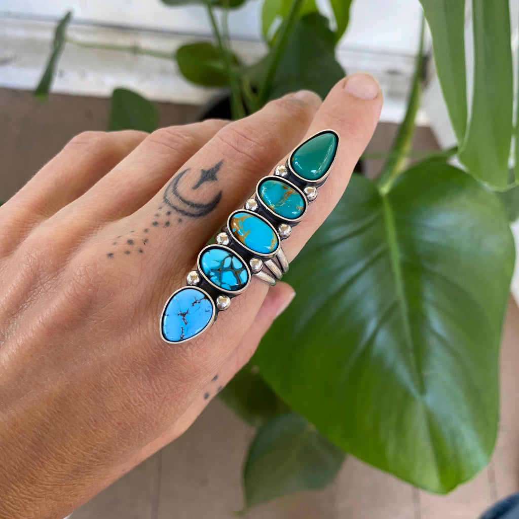 The Turquoise Collector ring features a dazzling array of pieces of Royston, Kingman, Lone Mountain, and Golden Hills turquoise. These gorgeous stones, set in an ombre fade, are on full display in a piece that's perfect for the most ardent of turquoise fans. These stones are set in an entirely hand-fabricated, one-of-a-kind, heavyweight solid sterling silver setting with handmade silver bubble accents. A magnificent piece that lets choice turquoise be the star of the show.