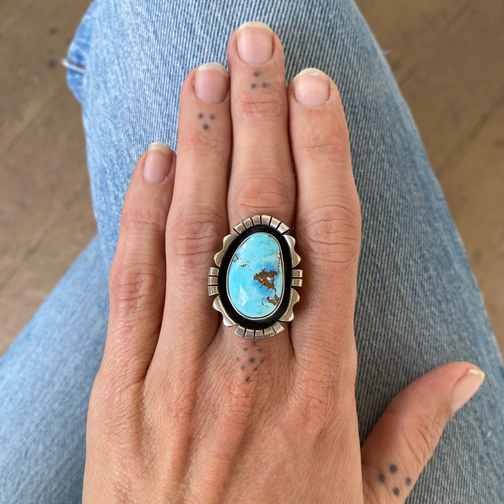 The Shadowbox ring features an amazing piece of natural high-grade Golden Hills turquoise. This stone, with its gemmy icy blue and lavender colors, is paired with a super chunky, meticulously sawed and filed sterling silver frame. The ornate sawed design highlights the stone's vivid hues, and is further accented by the recessed jet-black patina detailing. An elegant, heavyweight statement piece that's perfect for all occasions.