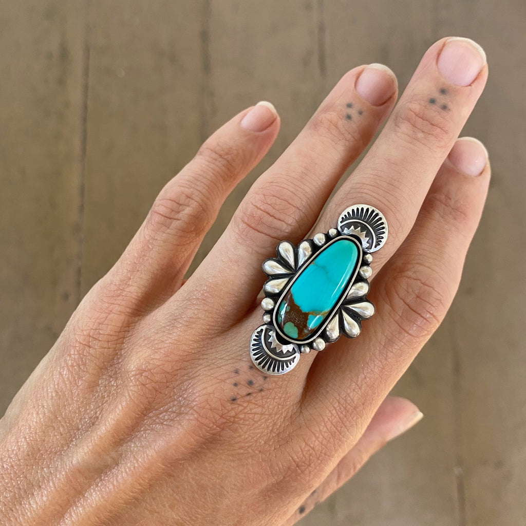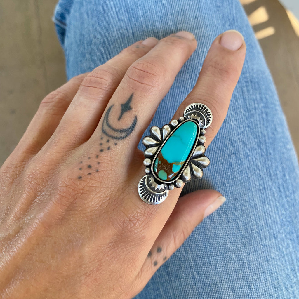 The Peacock ring features a gorgeous piece of Kingman turquoise mined in Arizona. This bright blue stone with a warm brown matrix and a pop of green is perfect when paired with our ornate Peacock design. Intricate details, from hand-stamped overlays to handmade sterling teardrops, are paired with a stunning piece of American mined turquoise for a unique statement piece that will never go out of style.
