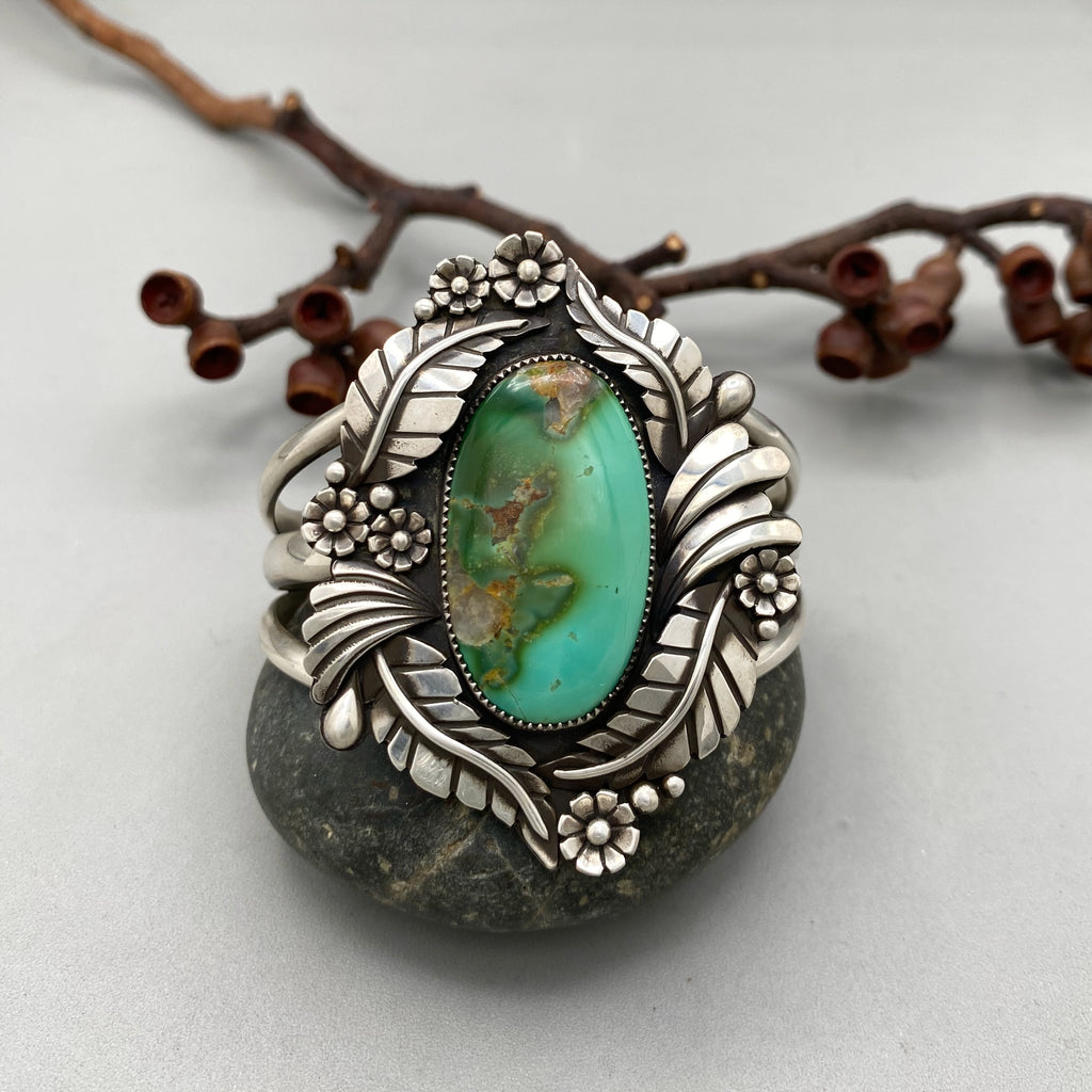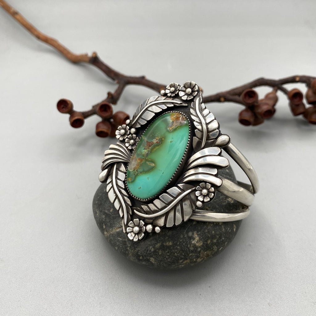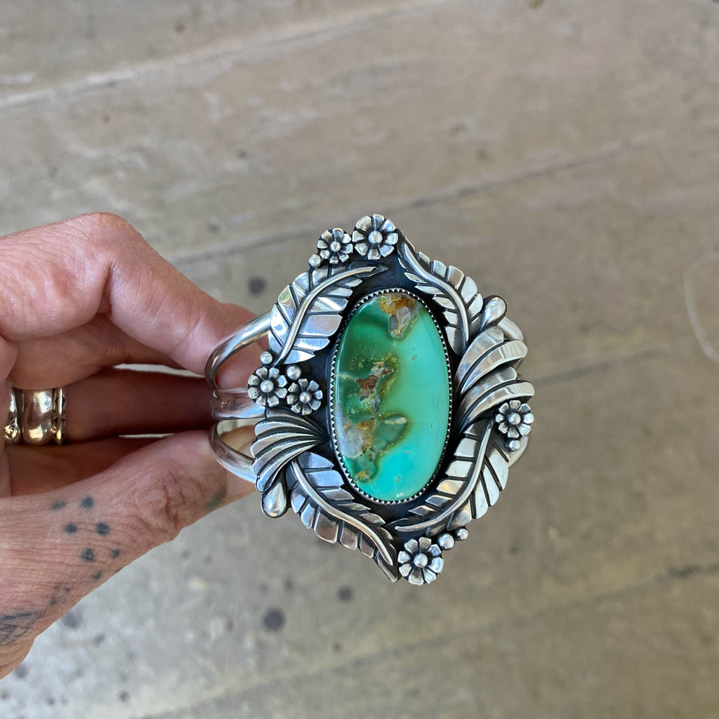 This huge, ornately crafted sterling silver cuff is 100% hand-fabricated. This bracelet features painstakingly handmade sterling leaves and flowers, contoured sterling fans, silver teardrops, and petite silver bubble accents. All this meticulous detailing is paired with an extra large piece of natural Royston mined in Nevada. The stone, with its polychromatic fade from minty to vibrant green, is set amongst the botanically-inspired details for a mind-blowing heirloom statement piece that's pure eye candy.