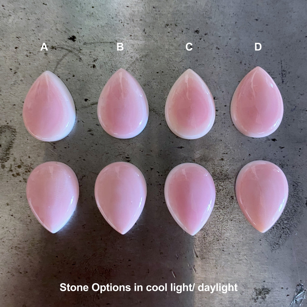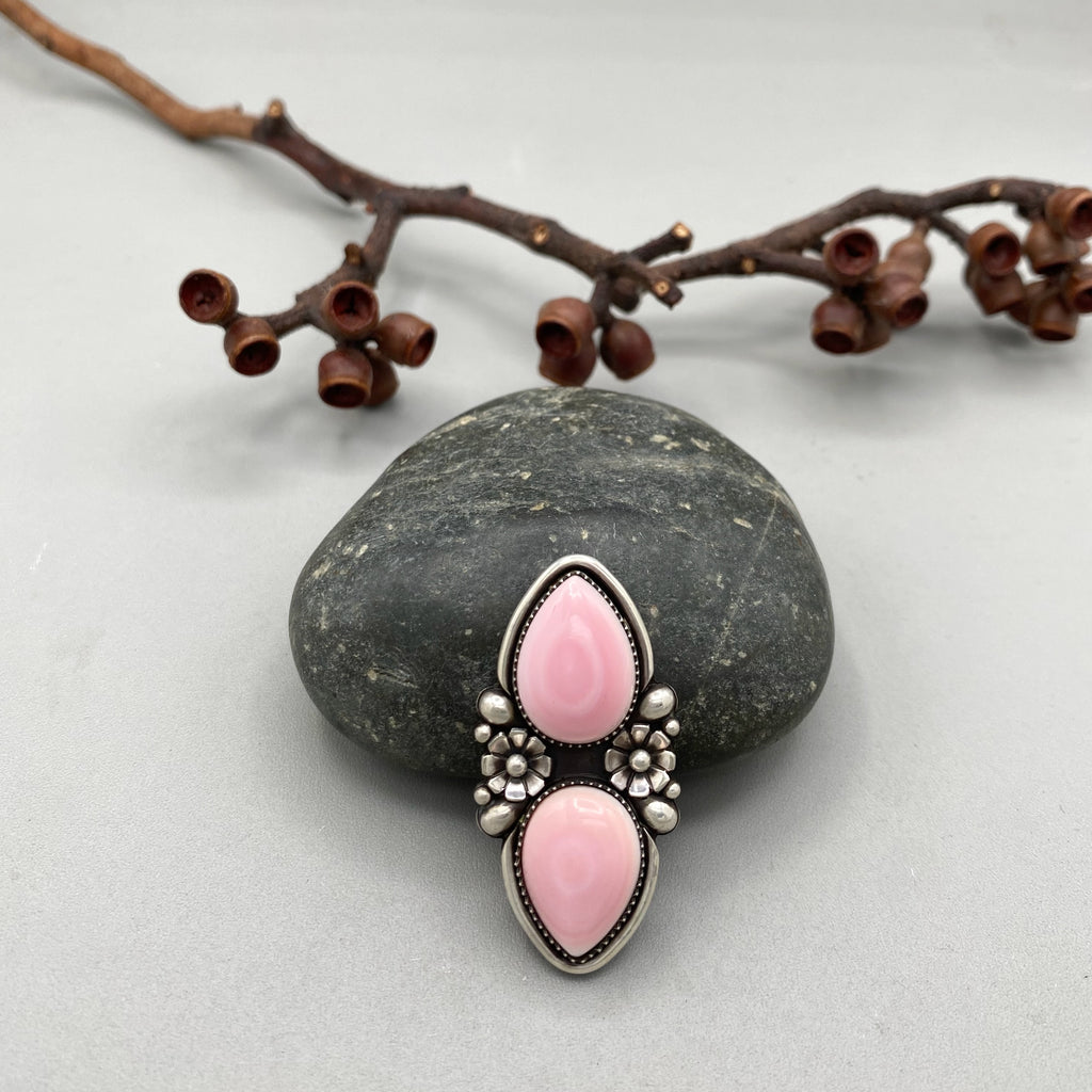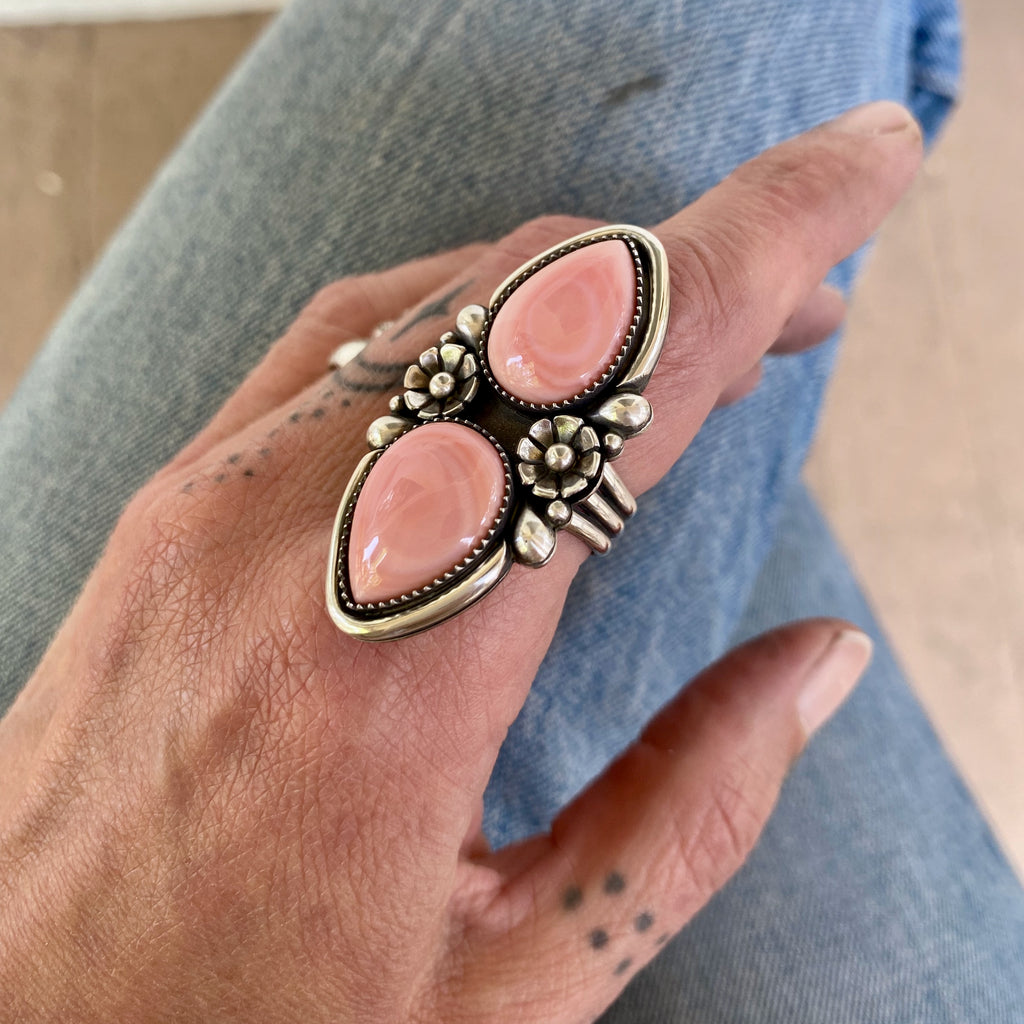 The Cherry Blossom ring has a lot going on; meticulous silver work including ornate handmade floral detailing is paired with 2 beautiful pieces of pink conch shell to create a unique piece that's truly one-of-a-kind. We're offering 4 of these rings as made-to-order in your size (or as a pendant!) Choose from the stone options below, and they will be set in an entirely hand-fabricated, heavyweight solid sterling silver Cherry Blossom setting. This piece features handmade sterling silver flowers, handcrafted fine silver teardrops, and petite silver bubbles. Elegantly custom-fabricated with your choice of stones, this personalized statement piece is simply breathtaking.