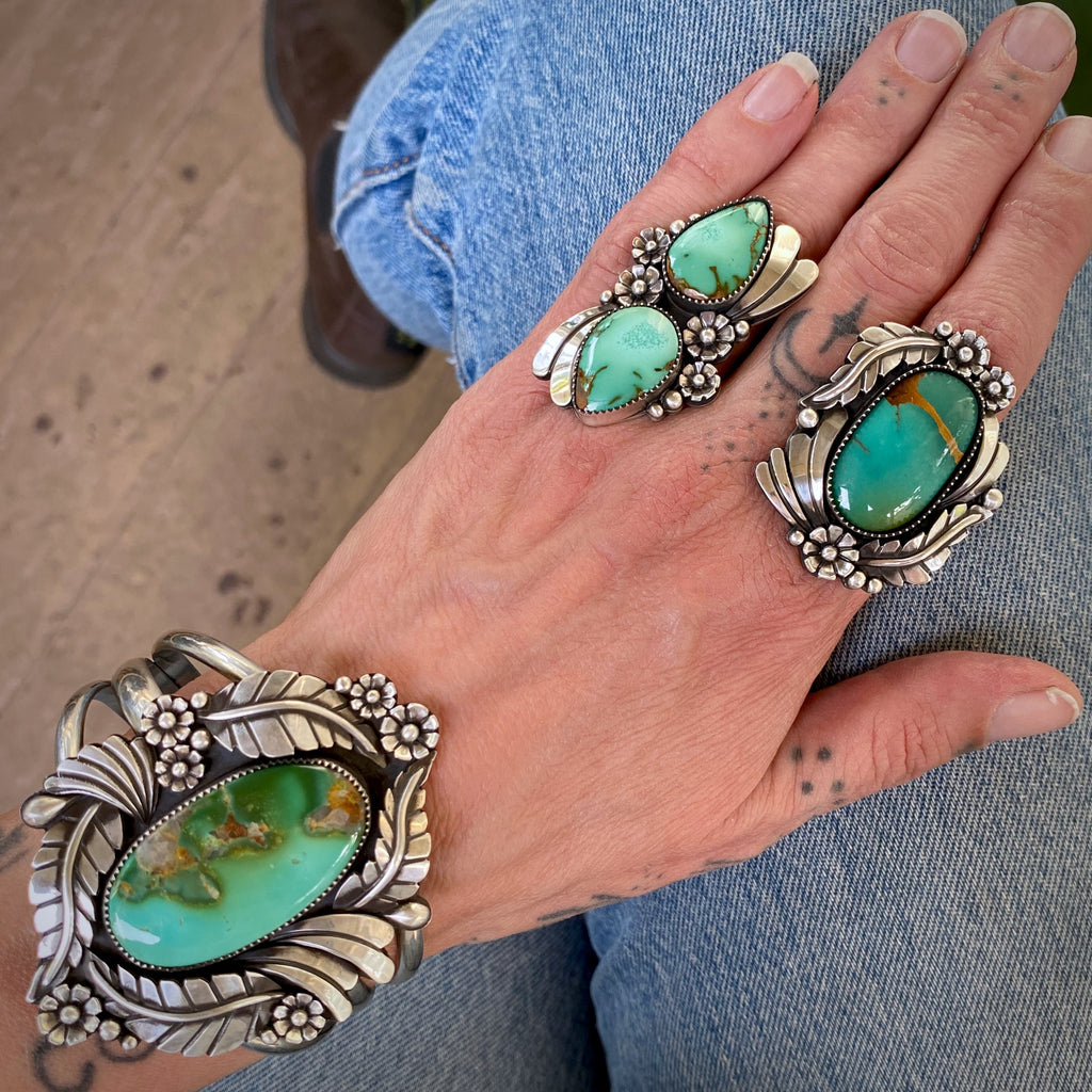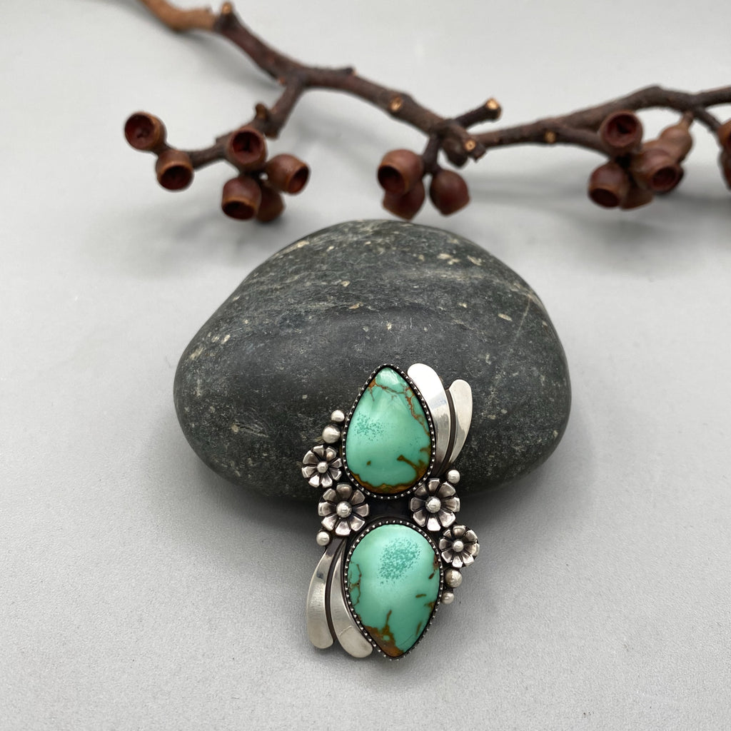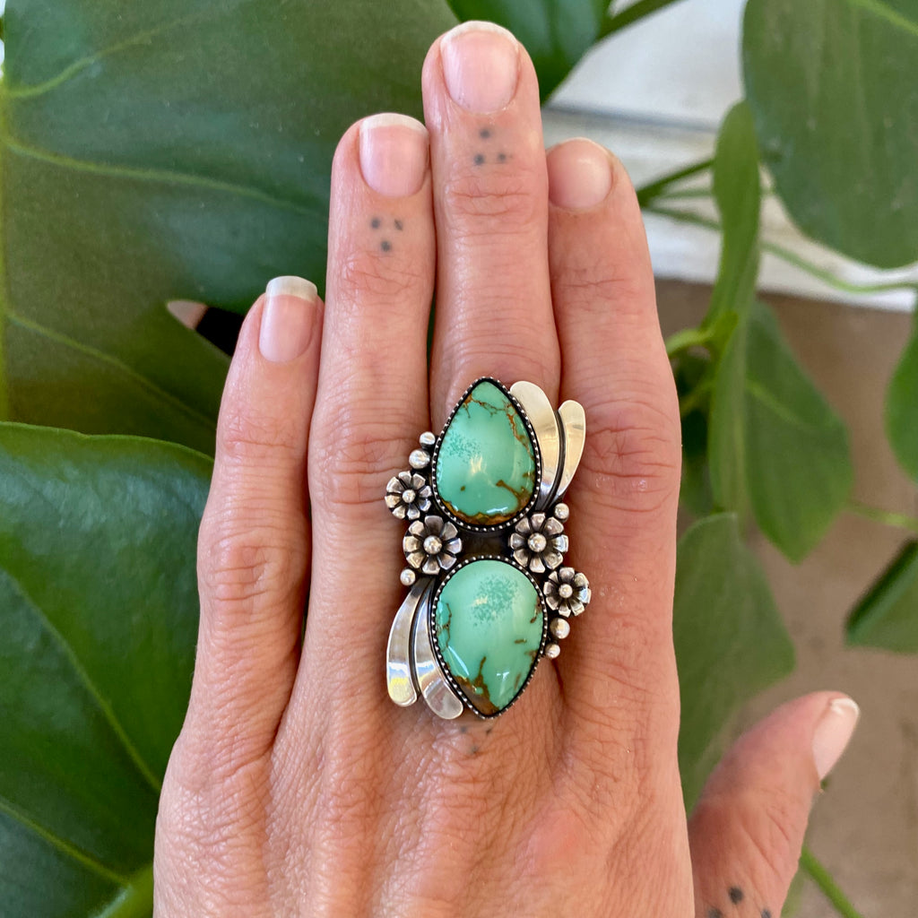 This ring features two exquisite pieces of natural high-grade Royston turquoise mined in Nevada. These high-grade stones are truly stunning with their gemmy, mint green color and subtle green speckles. These are coupled with meticulous, botanically-inspired silver work which includes handmade sterling silver flowers, sterling waves, and petite silver bubble accents. This ornate piece was crafted with lots of love and draws inspiration from a lush springtime garden in full bloom.