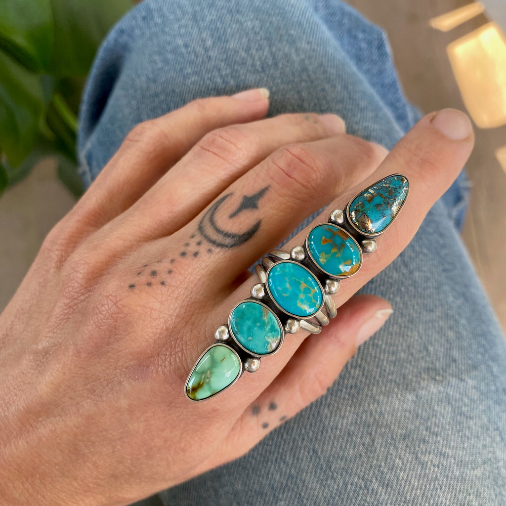 The Turquoise Collector ring features a dazzling array of pieces of natural Royston, Kingman, and Morenci II turquoise. These beautiful stones, set in a deep blue to light green fade, are on full display in a piece that's perfect for the most ardent of turquoise fans. These stones are set in an entirely hand-fabricated, one-of-a-kind, heavyweight solid sterling silver setting with handmade silver bubble accents. A gorgeous heirloom piece that puts high quality turquoise front and center.