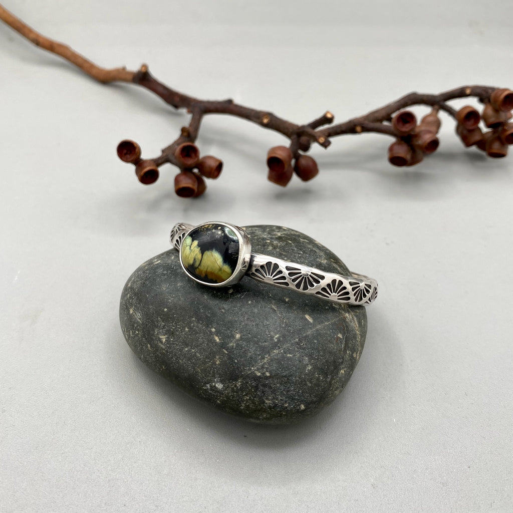 This heavyweight hand-stamped sterling silver cuff is fabricated out of super chunky 2 gauge sterling silver. This ornate bracelet features a stunning piece of New Lander variscite mined in Nevada. This stone, with its dazzling gold, green, and orange coloring atop a jet-black background, is set in a smooth, fine silver bezel atop a hand-stamped, solid sterling silver band. This weighty cuff is ideal for everyday wear.