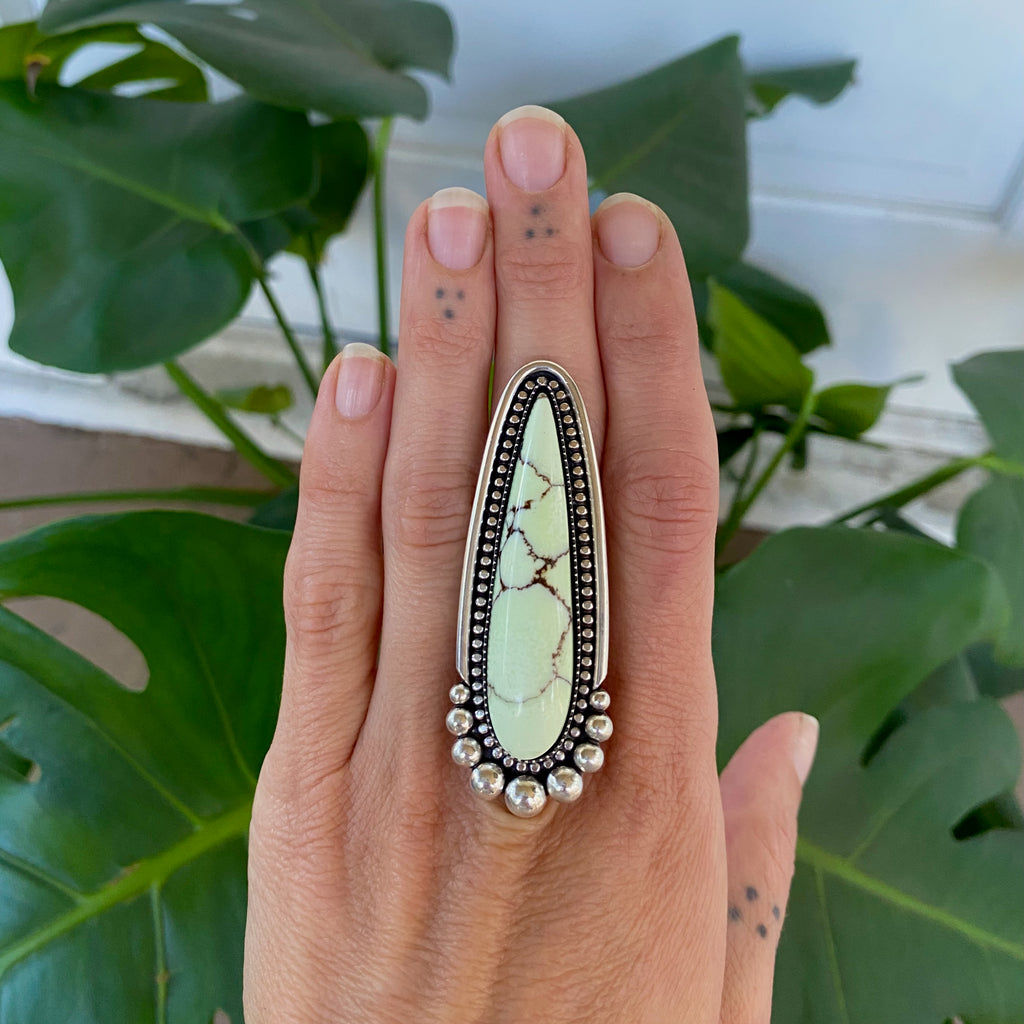 This huge Talon ring features a magnificent piece of natural Lemon chrysoprase. This stone, with its pale butter yellow color and mahogany matrix, creates an eye-catching look that's perfectly paired with our classic Talon design. A unique, eye-catching piece of chrysoprase is coupled with a timeless sterling design for a ring that is an essential statement piece.