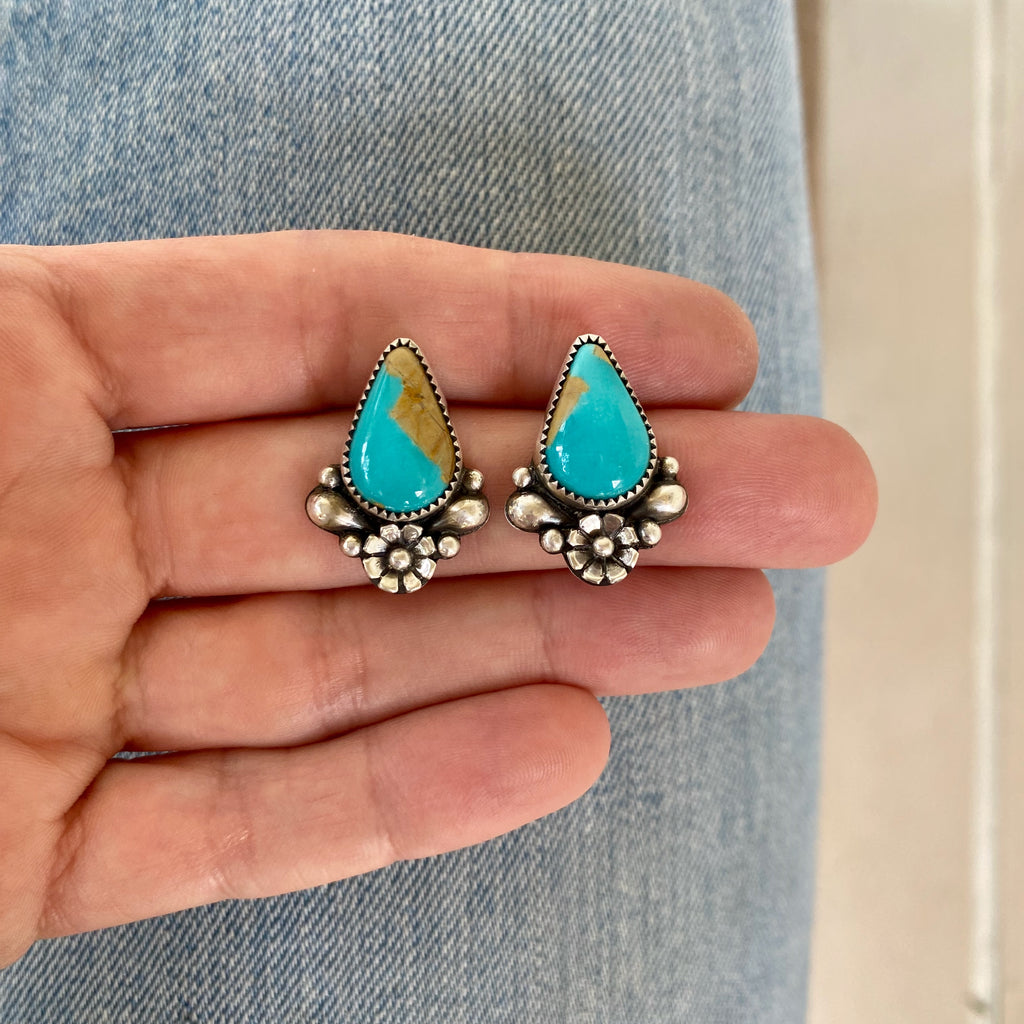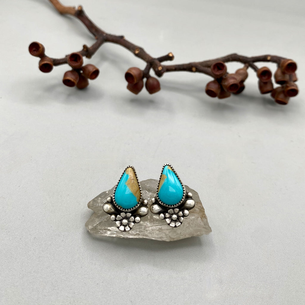 The Blossom earrings were handcrafted with springtime in mind. Their meticulously hand-fabricated settings feature sterling silver flowers, silver teardrops. and petite silver bubble accents. These ornate, botanically-inspired settings feature 2 dazzling pieces of natural Royston turquoise mined in Nevada. The stones, with their classic turquoise color and light brown matrix, are the perfect mate to their flowery settings. An intricate springtime design paired with classic American-mined turquoise make these earrings stunning all year long.