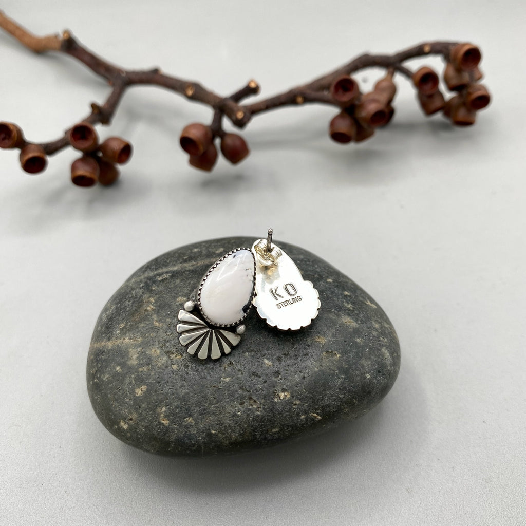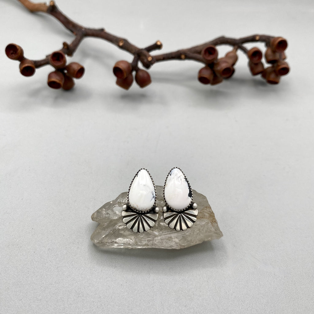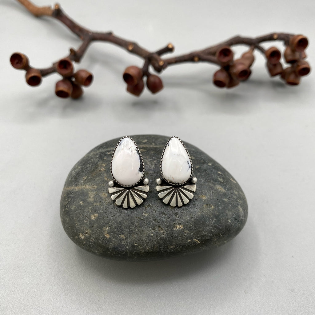 The Shield earrings feature big stamped sterling detailing on a small scale. These start with 2 beautiful pieces of natural White Buffalo mined in Nevada. The stones, with their bone-white color and sparse black matrix, are the perfect companion to their ornate, 100% handmade sterling silver settings. These hand-fabricated settings include hand-stamped and contoured sterling silver fans with handmade petite silver bubble accents. This elegant set of earrings is dying to be all yours.
