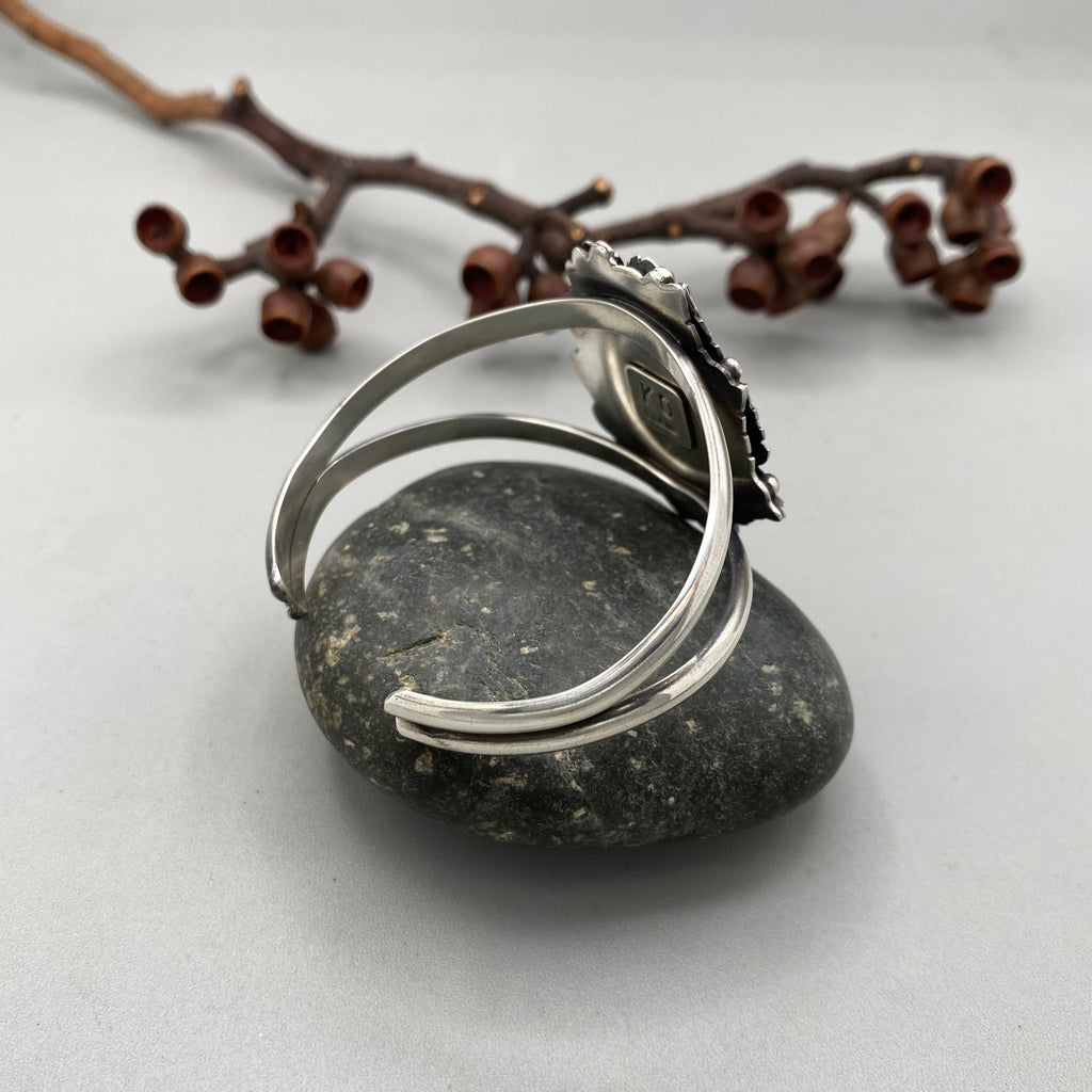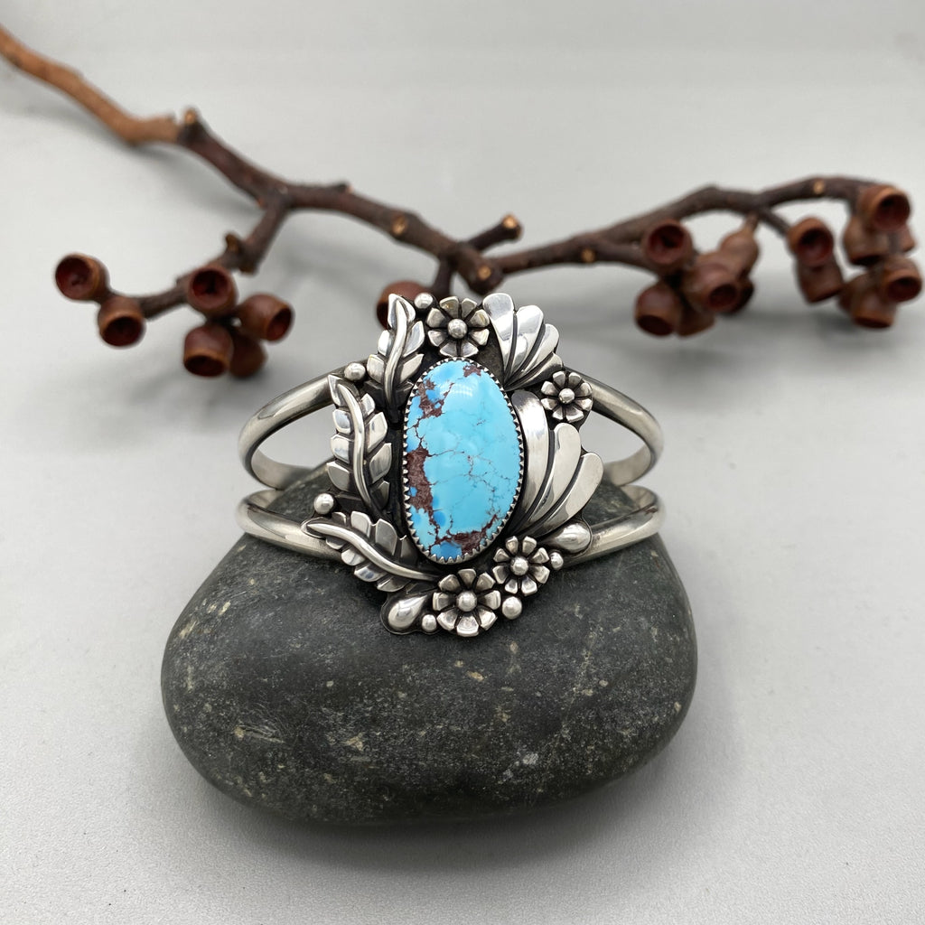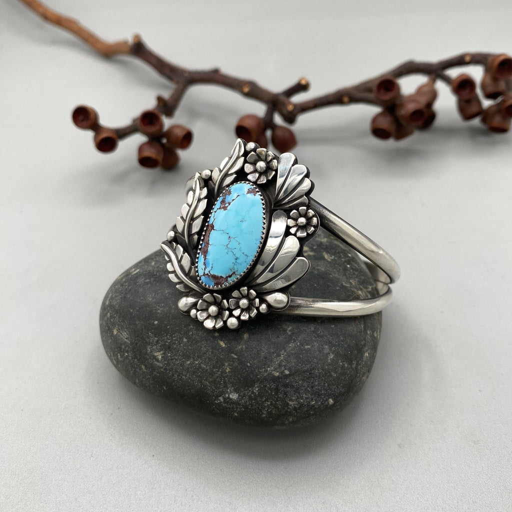 The Desert Rose cuff is an ornately crafted sterling silver cuff that is 100% hand-fabricated. This bracelet features painstakingly handmade sterling leaves and flowers, contoured sterling waves, silver teardrops, and petite silver bubble accents. All this meticulous detailing is paired with a spellbinding piece of natural high-grade Golden Hills turquoise. The stone, with its pale blue hues and dark matrix, is set amongst the botanically-inspired silver details for a magnificent heirloom statement piece that's pure eye candy.