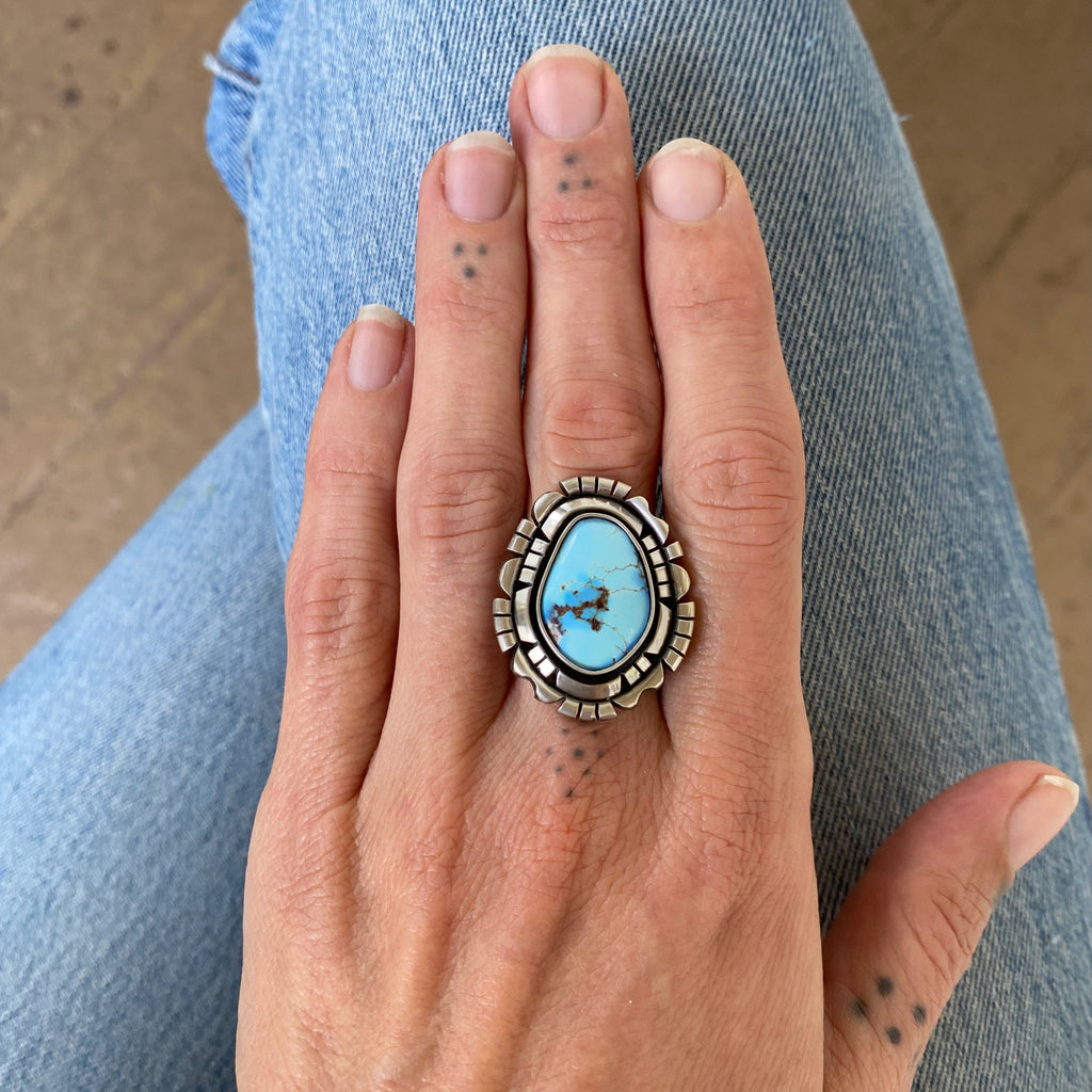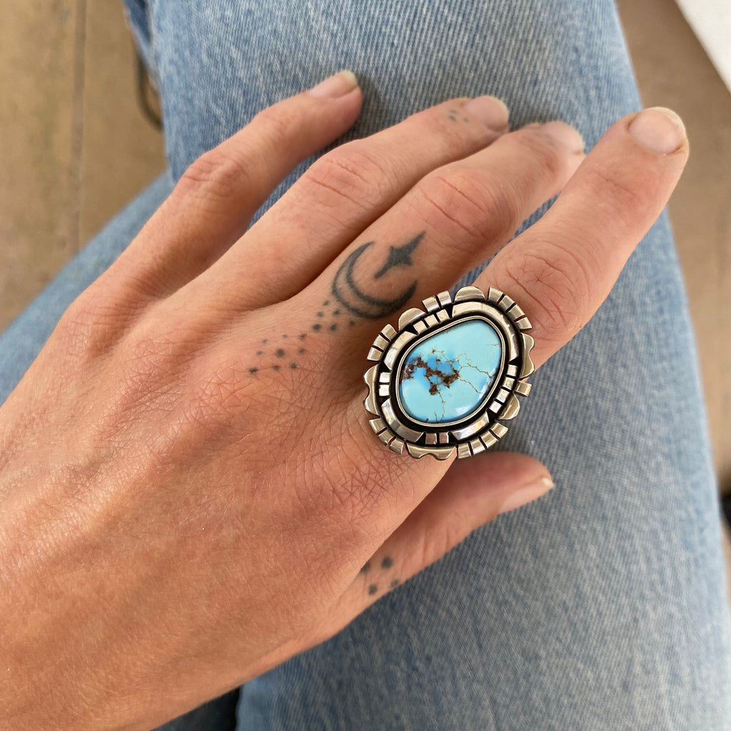 The Silhouette ring is truly breathtaking. This ring features a dreamy piece of natural high-grade Golden Hills turquoise. The stone, with its varying shades of lavender and pale blue with a sparse dark brown matrix, is paired with two meticulously sawed and filed polished sterling silver frames. The ornate sawed detailing combined with the piece's dark recessed patina accents and high shine finish create a truly spellbinding effect. This heirloom statement piece will dazzle for years to come.