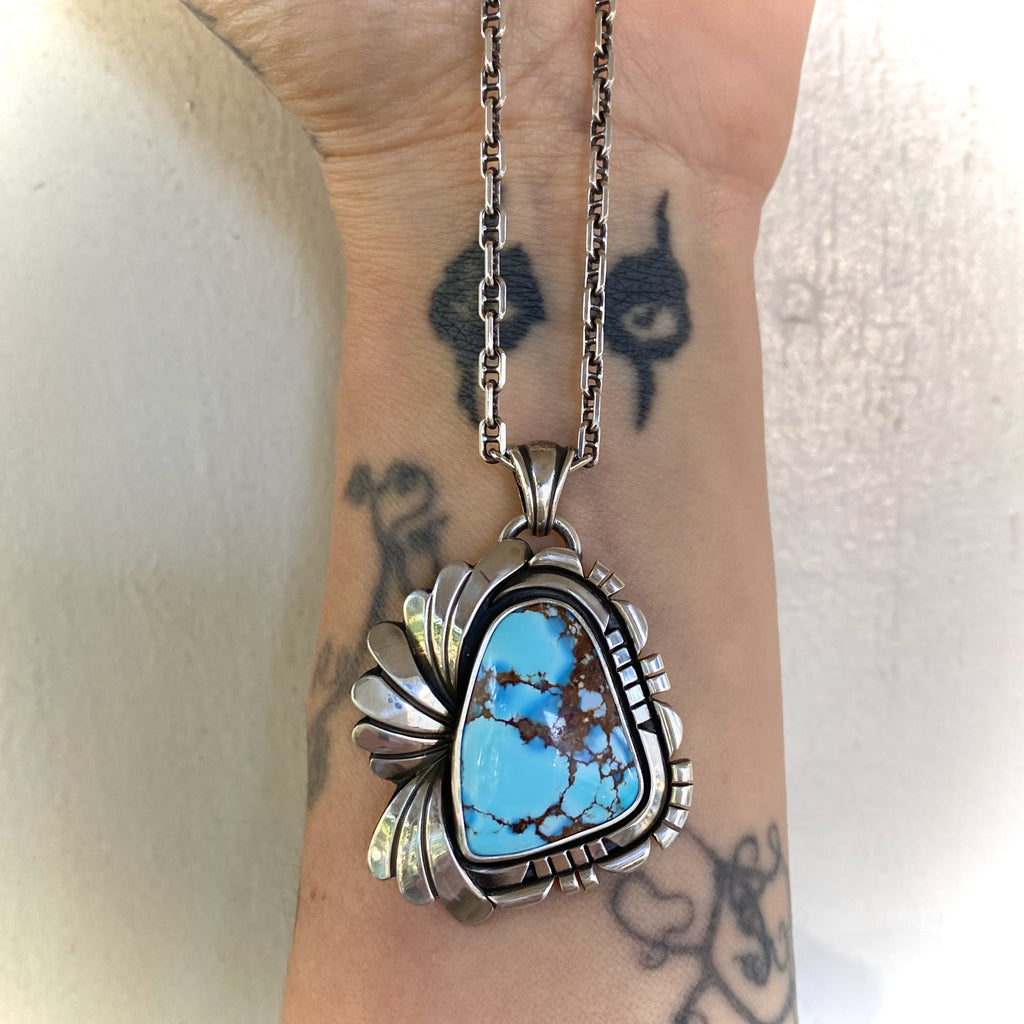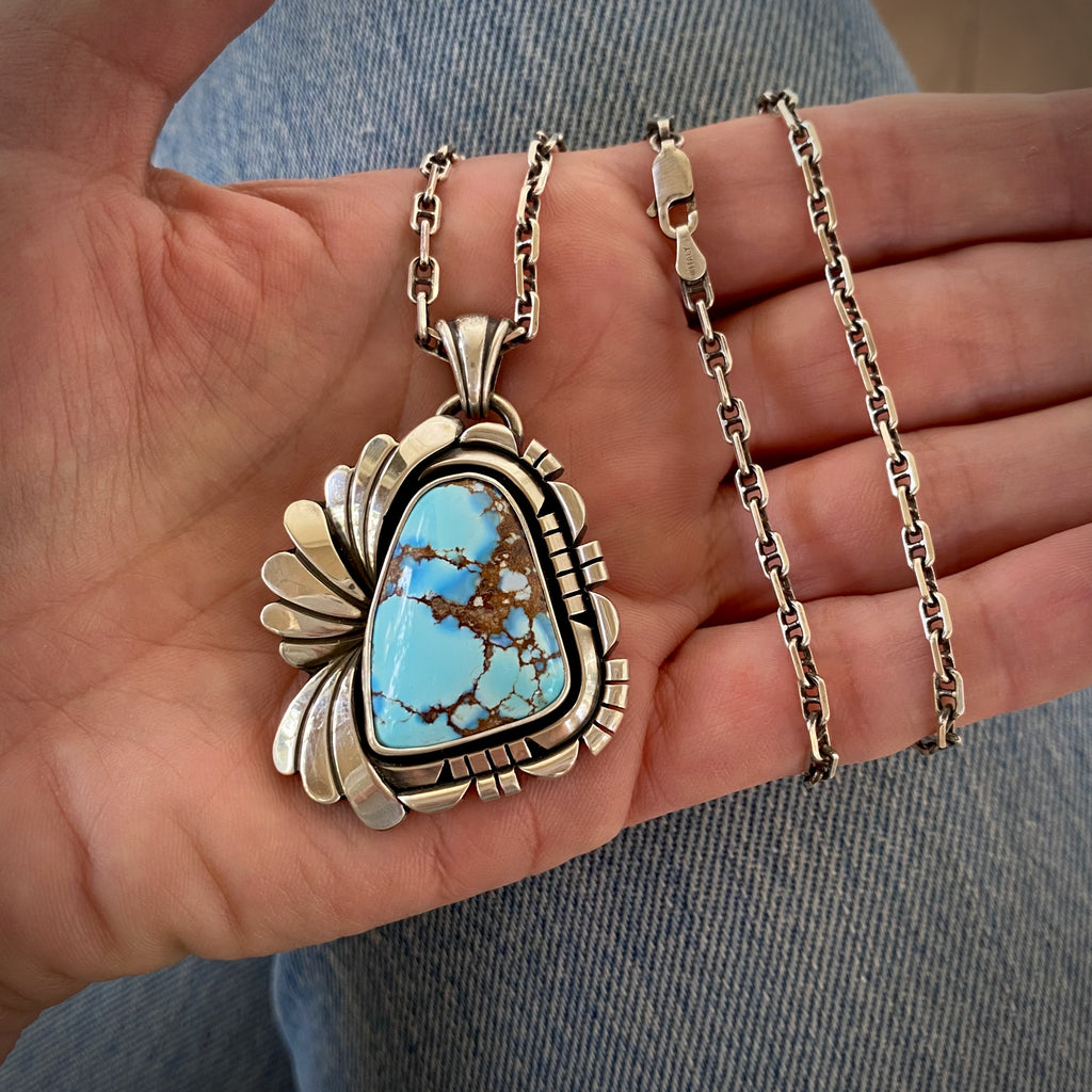 The Twin Palms necklace features a jaw-dropping piece of natural high-grade Golden Hills turquoise. This rare, large chunk of Golden Hills, with its pale blue and lavender hues and dramatic dark brown matrix, is a perfect companion to its ornately detailed solid sterling silver setting. The setting is entirely handmade and features 2 meticulously sawed and filed sterling frames and hand-stamped contoured sterling waves. The design is further accented by recessed jet-black patina detailing for a statement piece with lots of movement, shine, and contrast. The perfect piece for fans of elegantly designed jewelry crafted with lots of love. This pendant comes with an 18" sterling silver anchor chain.