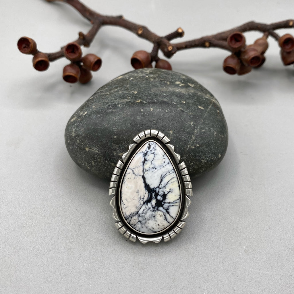 The Blizzard ring features an amazing piece of natural high-grade White Buffalo mined in Nevada. This stone, with its snowy white color and dramatic black matrix, is paired with a super chunky, meticulously sawed sterling silver frame. The ornate sawed detailing highlights the stone's unique patterns, and is further accented by the recessed jet-black patina detailing. A heavyweight statement piece that's perfect for all occasions.