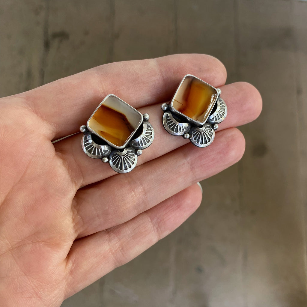 The Daybreak earrings feature 2 gorgeous pieces of Montana agate. These stones, with their swirls of orange, gold, and brown, are set in entirely hand-fabricated solid sterling silver settings featuring a hand-stamped contoured overlay detailing and handmade petite silver bubble accents. This ornate design paired with these stunning pieces of agate with their fall color palette make these earrings perfect for daily wear.