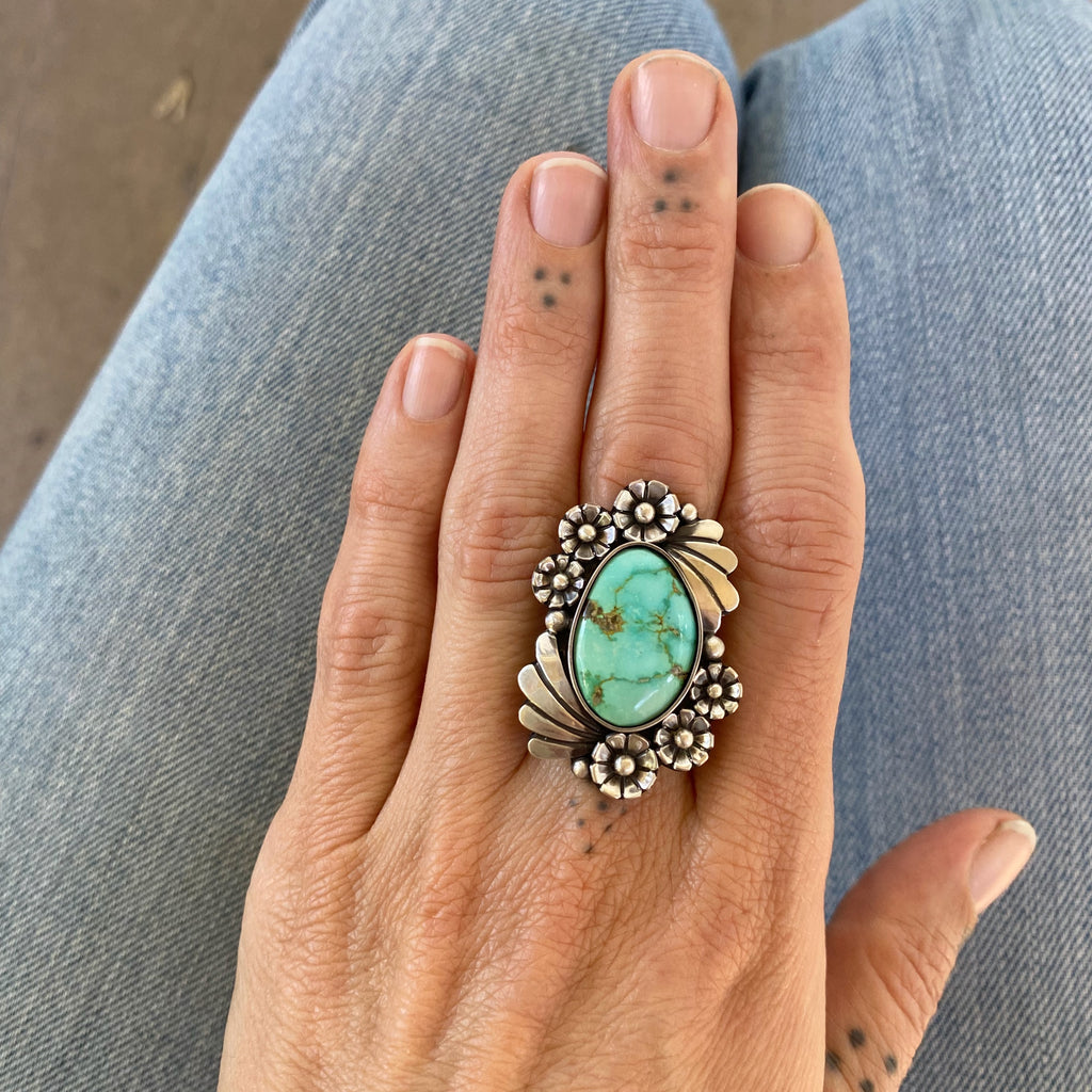 The Desert Rose ring features an awesome piece of natural high-grade Royston turquoise mined in Nevada. This exquisite stone, with its gemmy light blue color and waterwebbing, is a perfect companion to the setting's intricate, botanically-inspired silver work. The 100% handcrafted detailing on this piece includes contoured sterling silver waves, sterling flowers and buds. This heirloom statement piece is perfect for fans of ornate floral detailing.