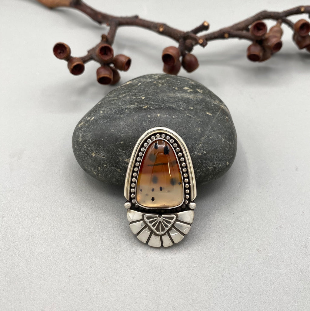 The Portal ring features a magnificent piece of Montana agate. This stunning stone is set in our best-selling portal design which features a hand-stamped, contoured sterling silver fan and handcrafted petite silver bubble accents. This stone, true to its Montana agate roots, includes a fall color palette with dainty black spots and is a perfect companion to the piece's bold, entirely handmade sterling design. This classic heirloom statement piece is a perfect addition to any jewelry collection.