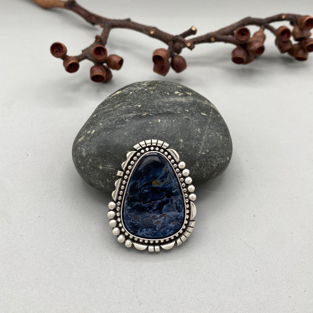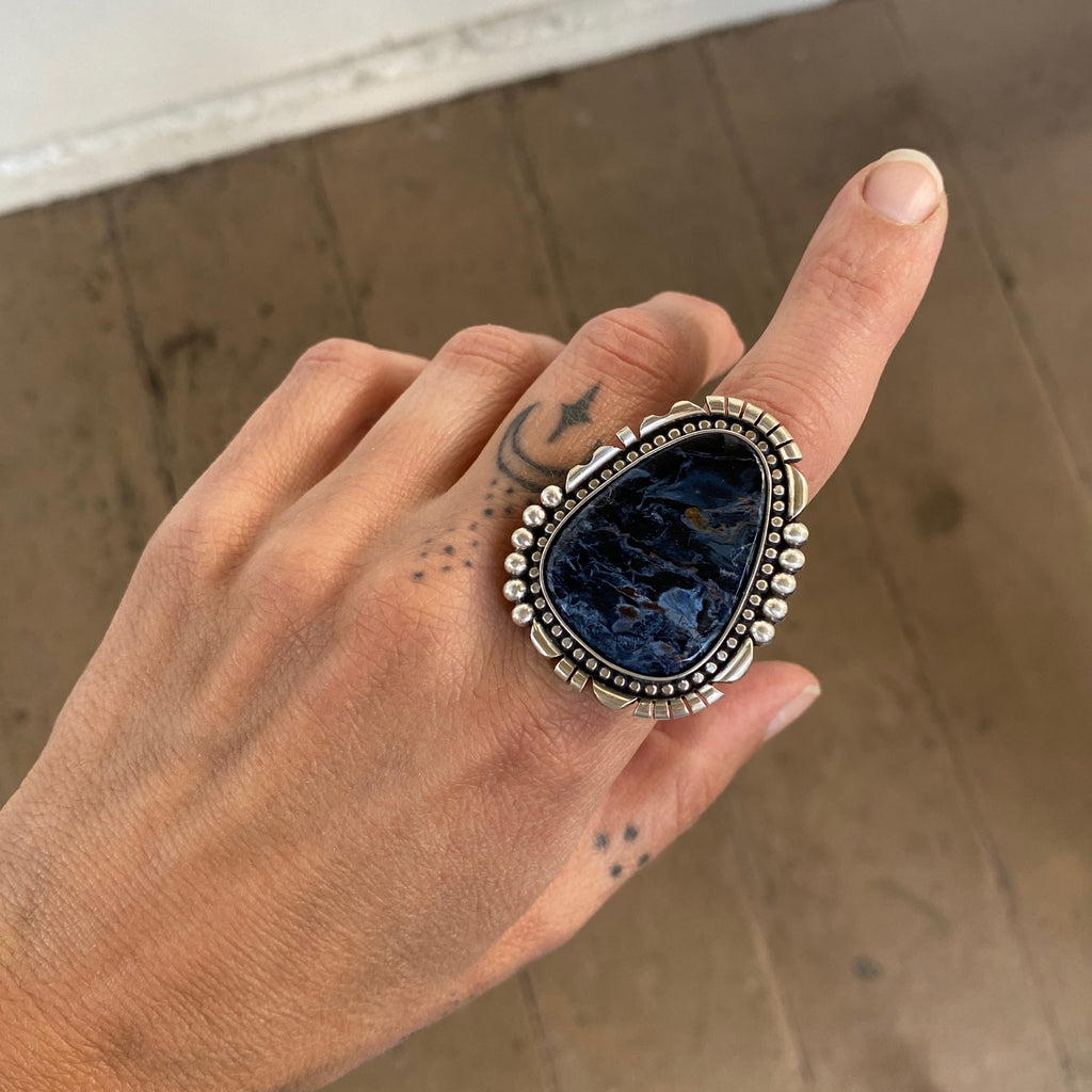 The Tempest ring features a magnificent piece of pietersite. This stone, with its deep blue color and swirling chatoyance, creates a bold and moody look that's paired perfectly with its chunky, meticulously sawed sterling silver setting. A heavyweight hand-sawed sterling frame coupled with silver bubble detailing and a dark and brooding piece of pietersite makes this unique statement piece a must have.