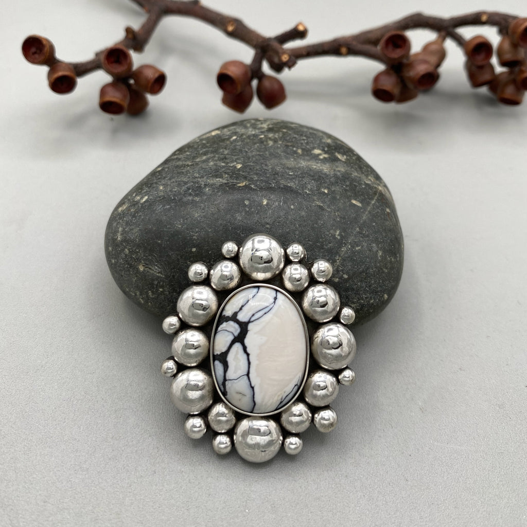 The White Buffalo Supernova ring, done in our classic super bubble design, features an exquisite piece of natural high-grade White Buffalo mined in Nevada. This elegant stone, with its creamy white color and jet-black matrix, is set in an entirely hand-fabricated, one-of-a-kind, heavyweight solid sterling silver setting. A timeless statement piece that will dazzle in any occasion.